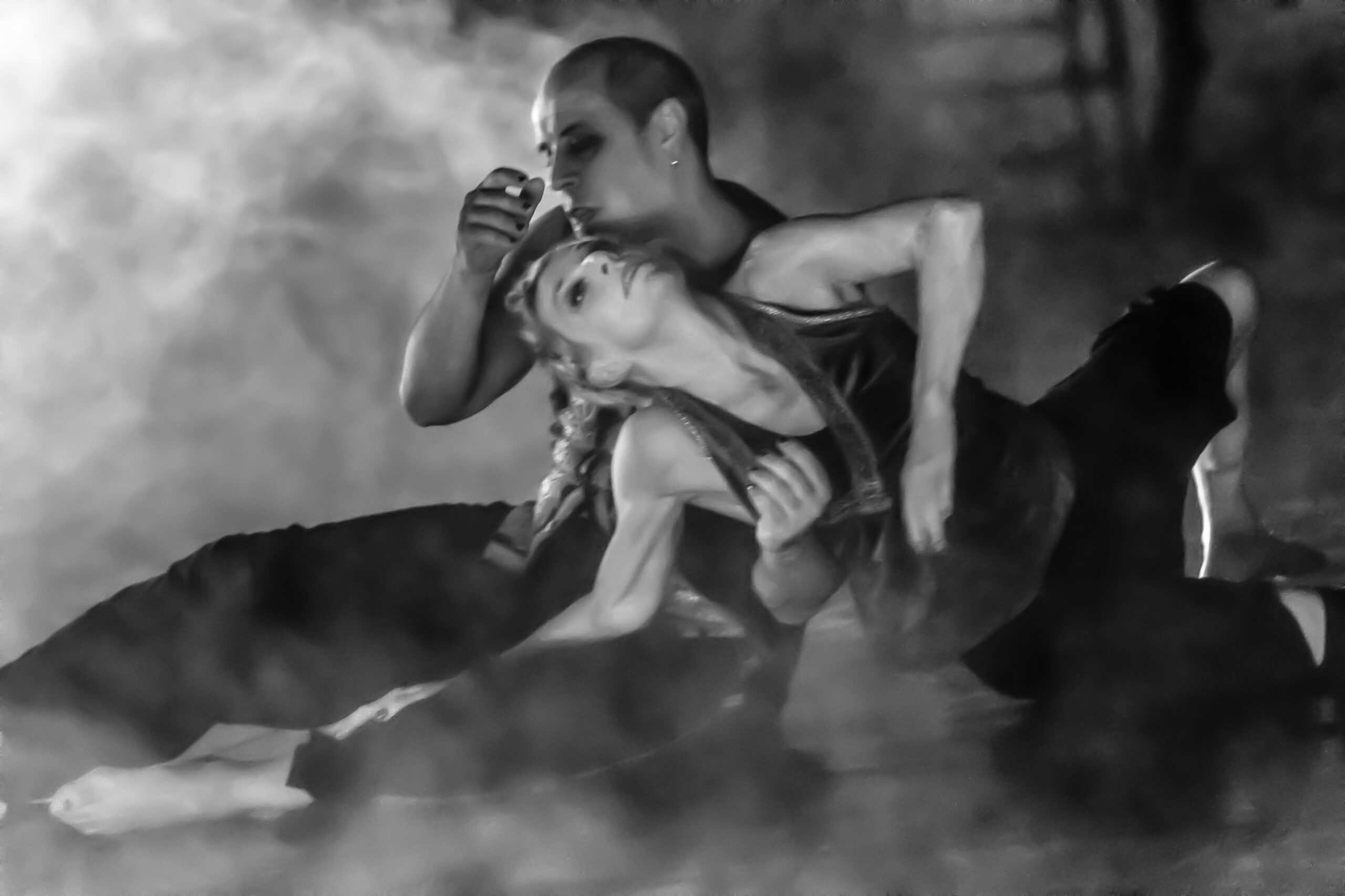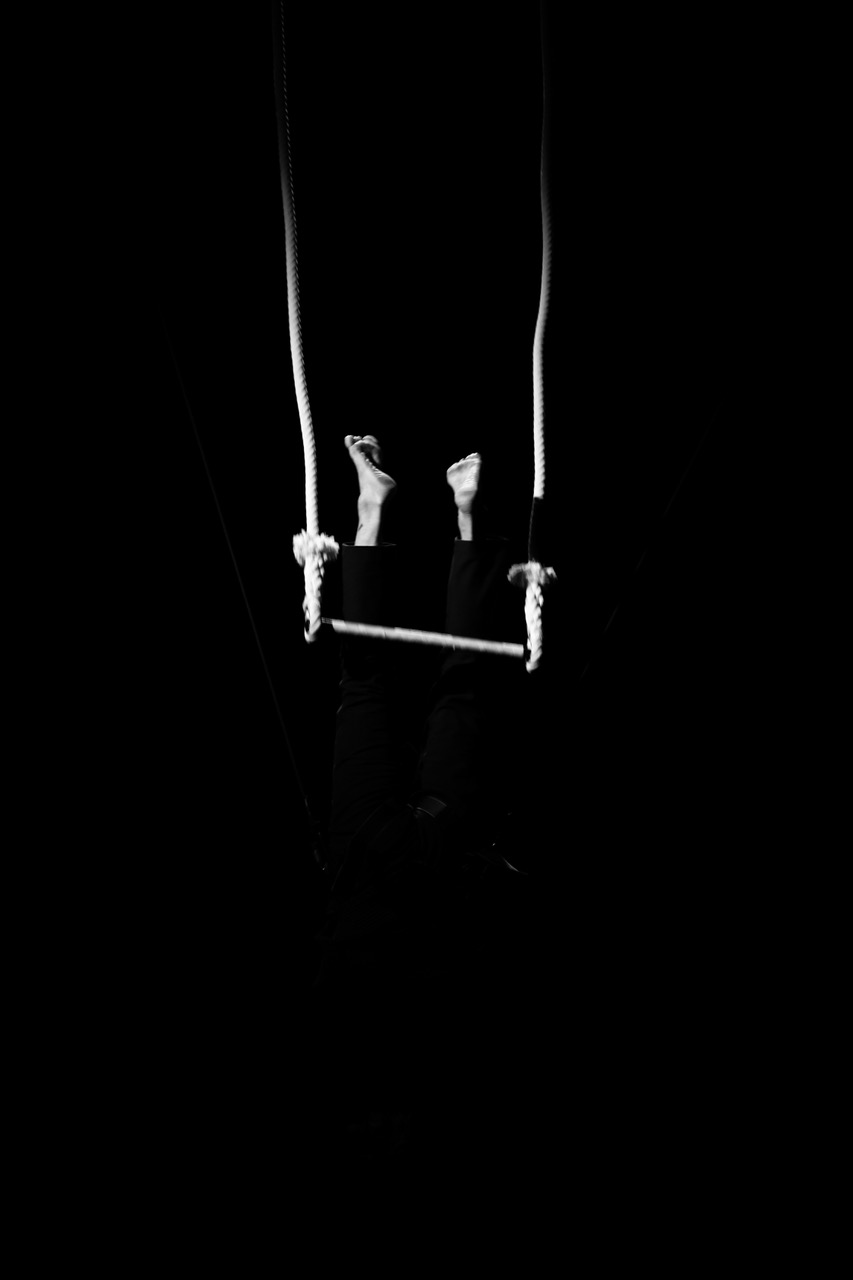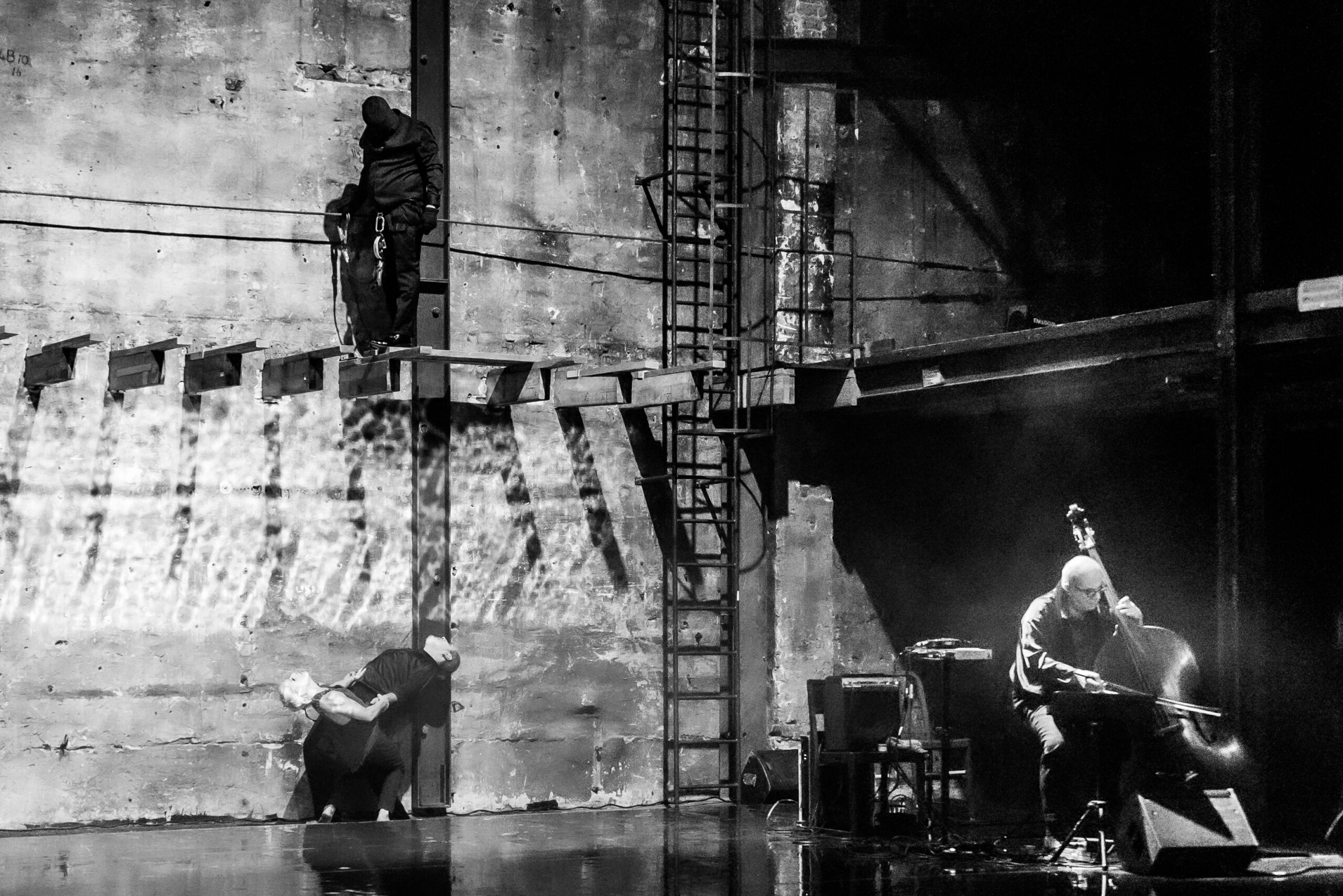 Öfverholm inleder i trapets och vältrar sig själv baklänges ner på golvet, sjunger Sinatras That’s life och kastar sig in i en kampfylld koreografi med scenkollegan Jordi Cortes. I en intim duett låter de kroppens begränsningar och livets skörhet sättas i spel. De två utgör hjärtat av föreställningens kvartett, där Lauri Antilas raspiga bas och Tobias Hallgrens dödsängellika gestalt med piska skapar en dramatisk kontrapunkt.